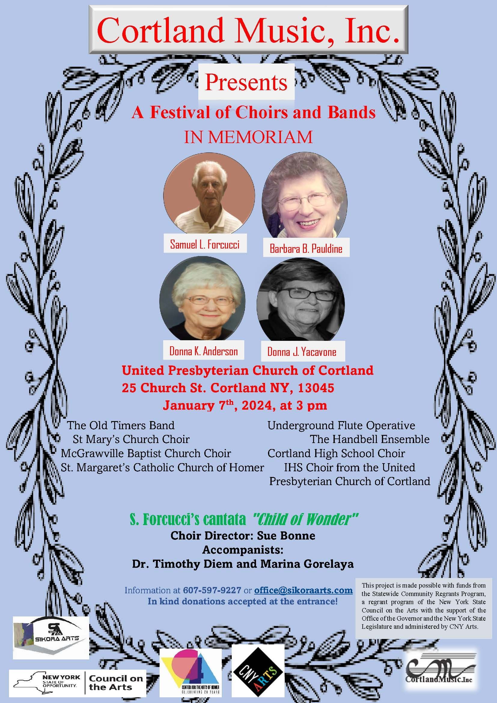 Cortland Music, Inc. is a non-profit organization that was registered in the State of New York on April 22, 2009 and is now recognized as 501(c)(3) tax exempt by the IRS.